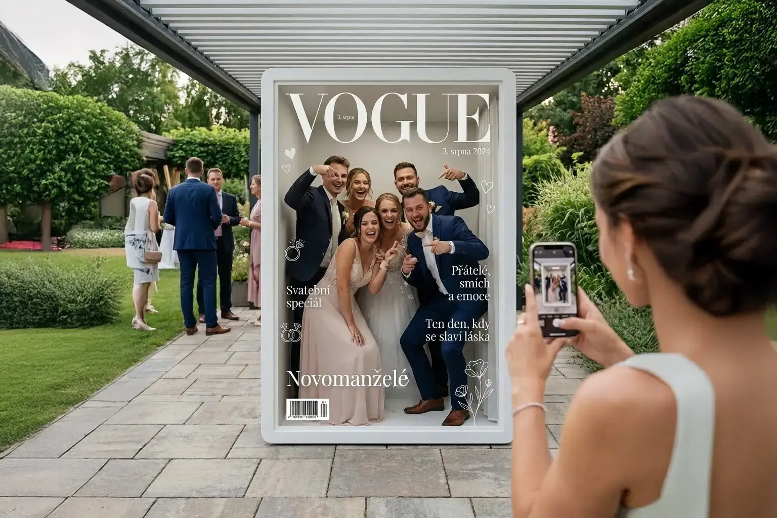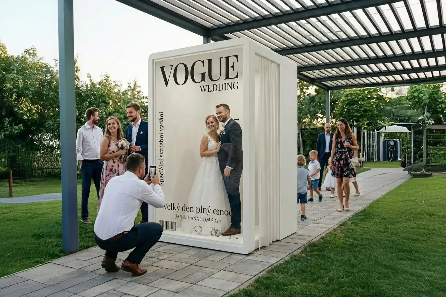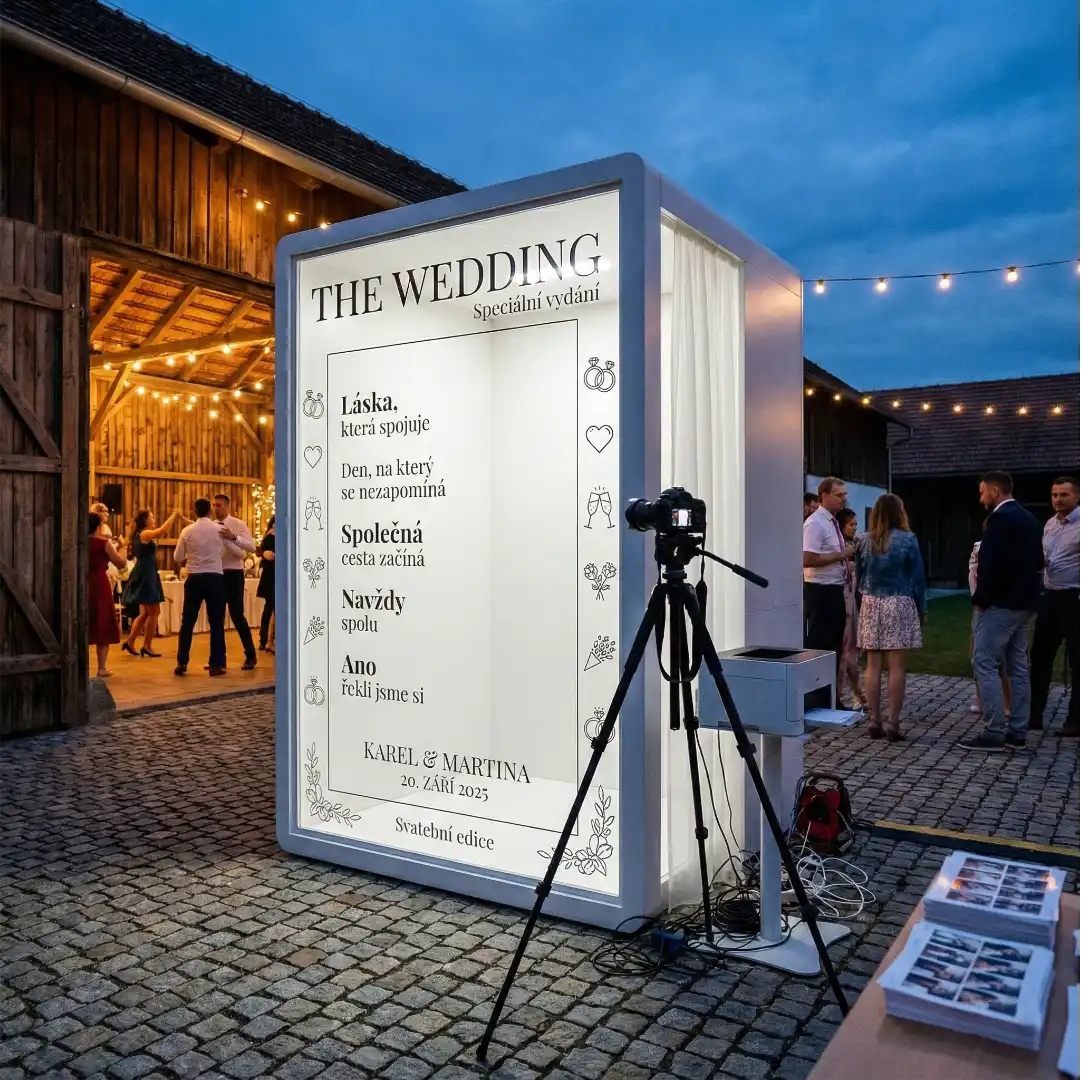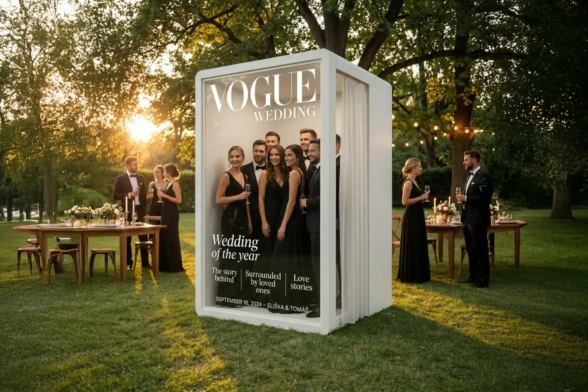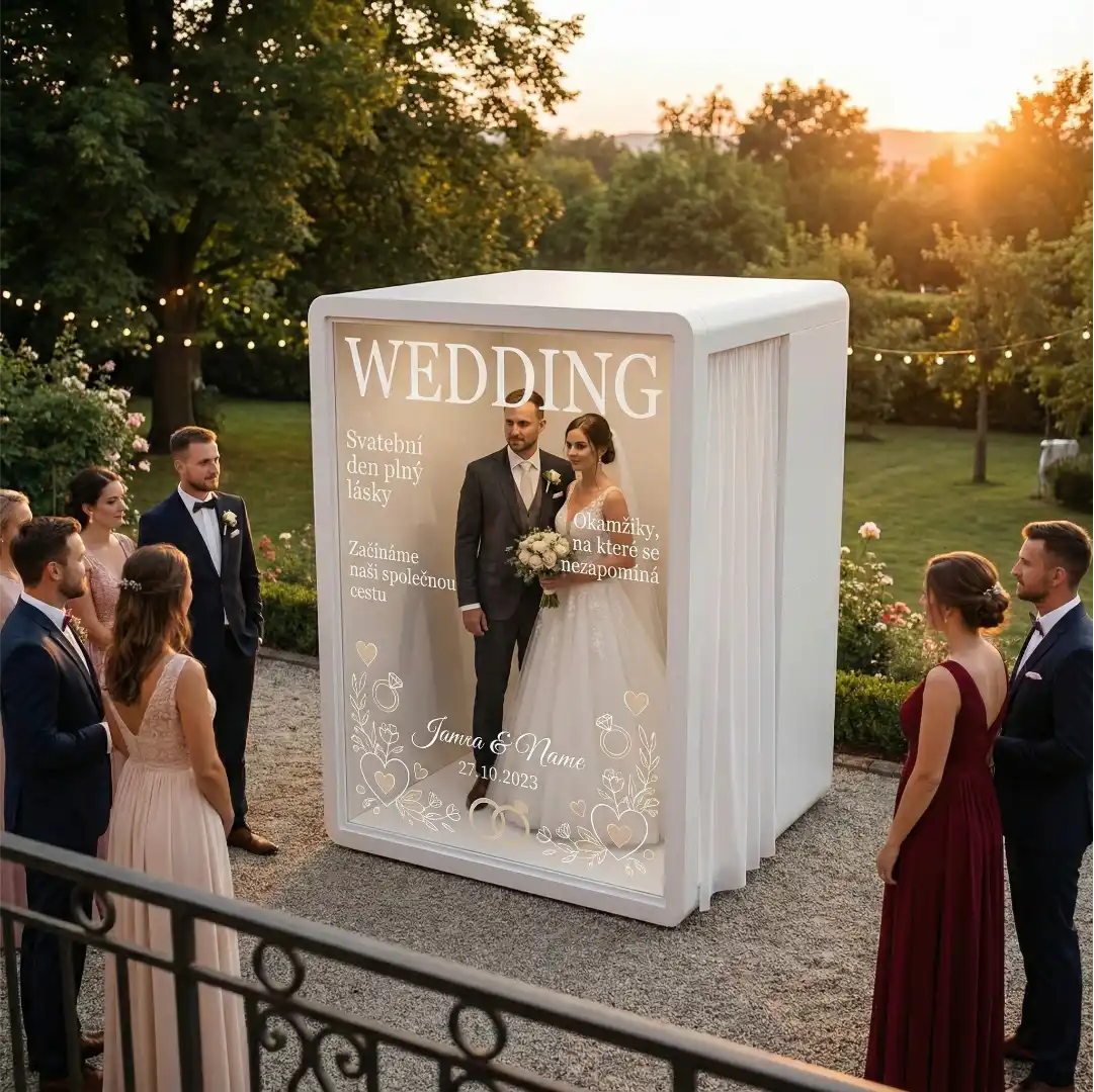 Fotobox vytváří na svatbě elegantní scénu, kterou vyladíme přesně podle vašeho dne — od personalizovaného polepu skla až po jemné detaily uvnitř. Díky tomu vzniknou momenty, které mají příběh.