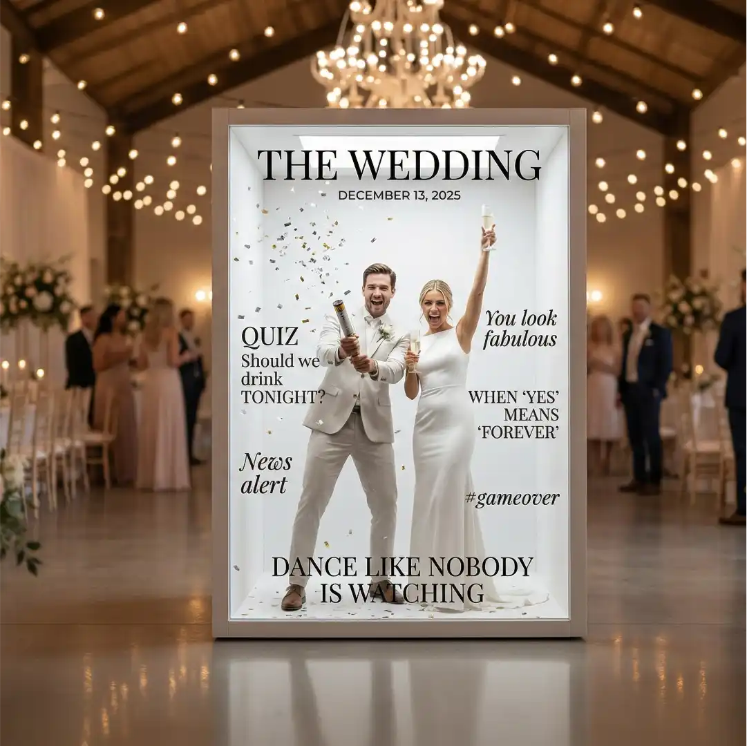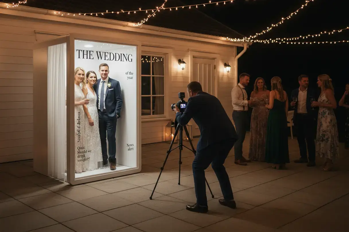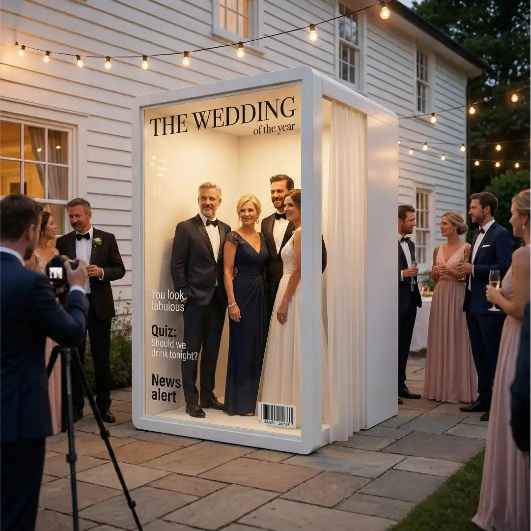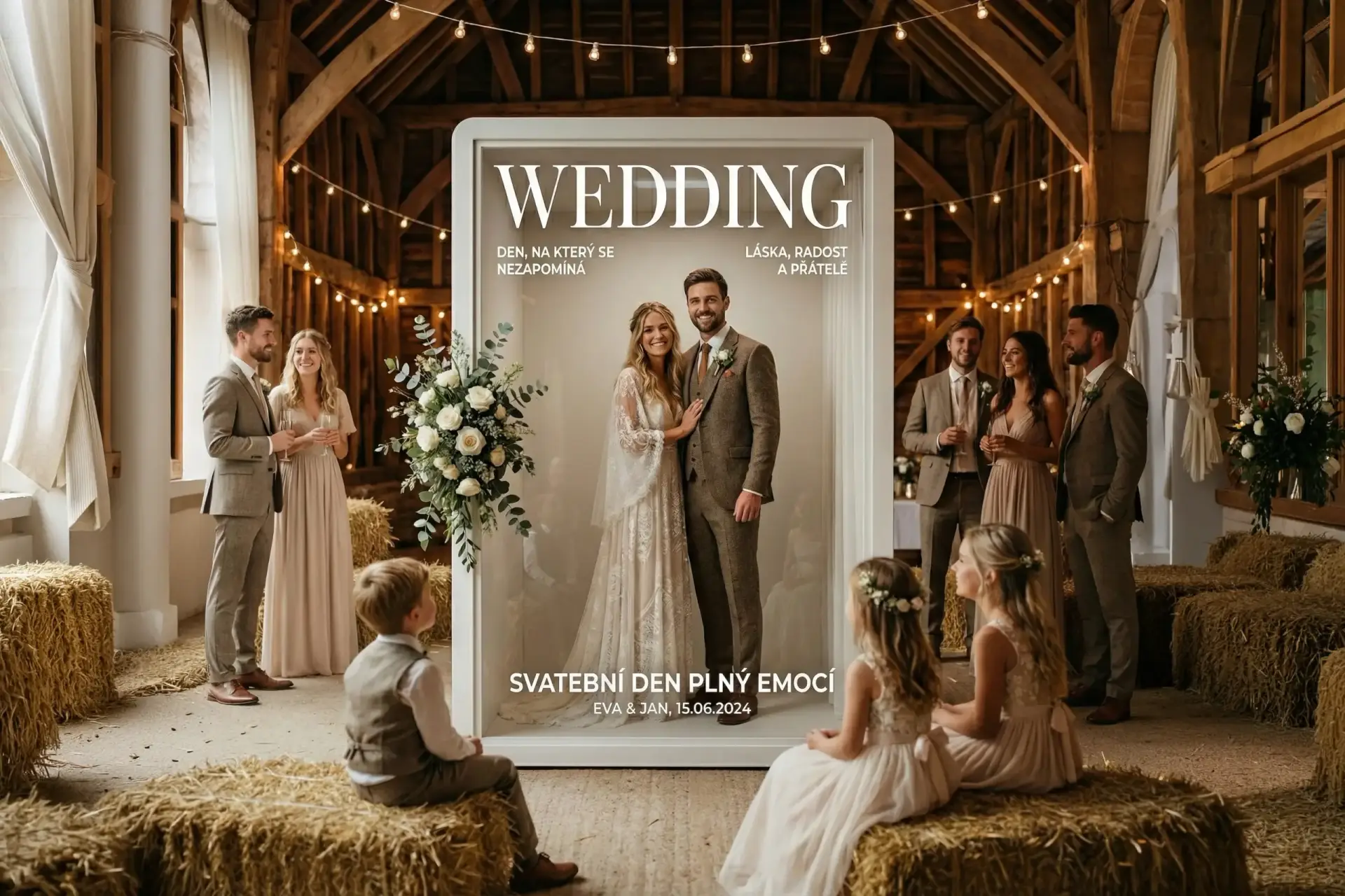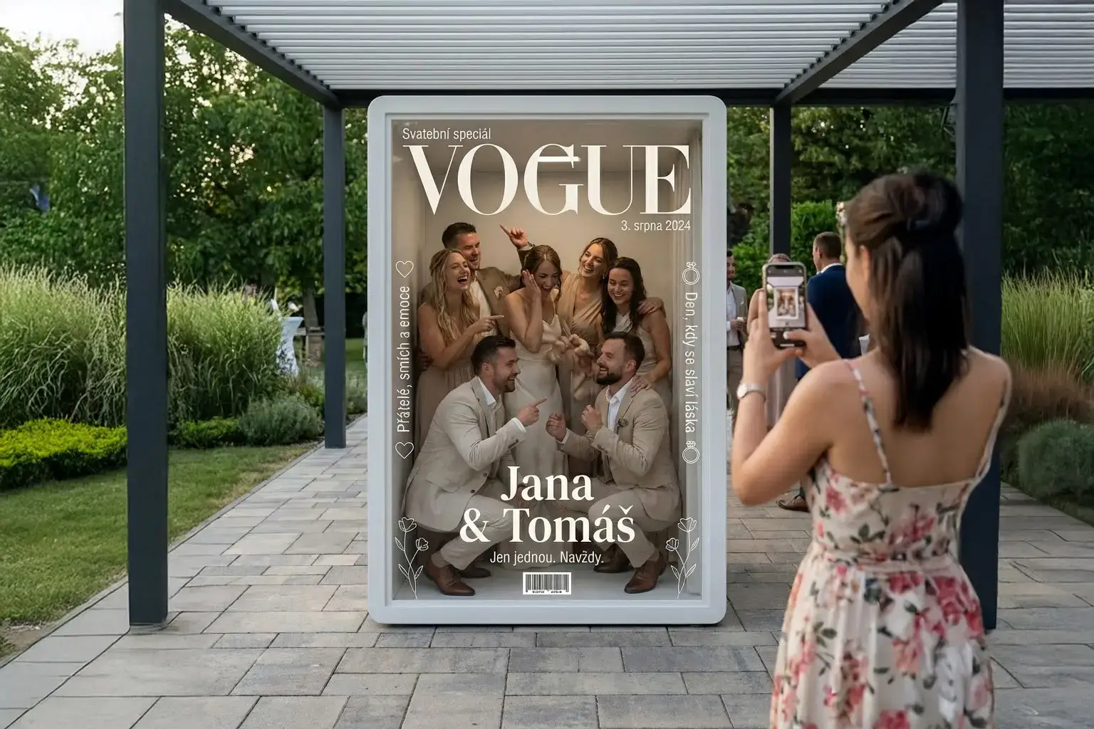 Fotobox vytváří na svatbě elegantní scénu, kterou vyladíme přesně podle vašeho dne — od personalizovaného polepu skla až po jemné detaily uvnitř. Díky tomu vzniknou momenty, které mají příběh.