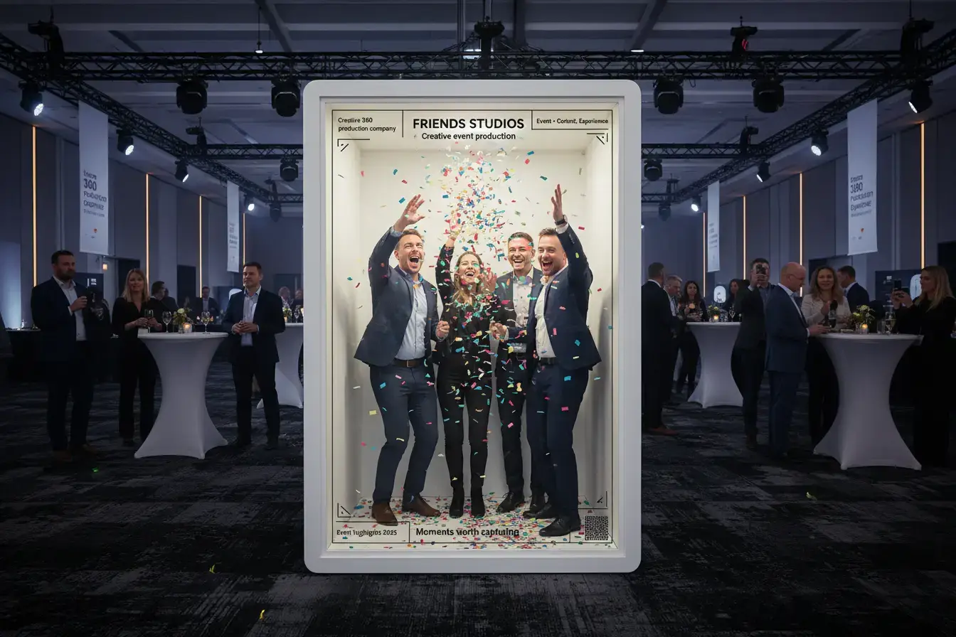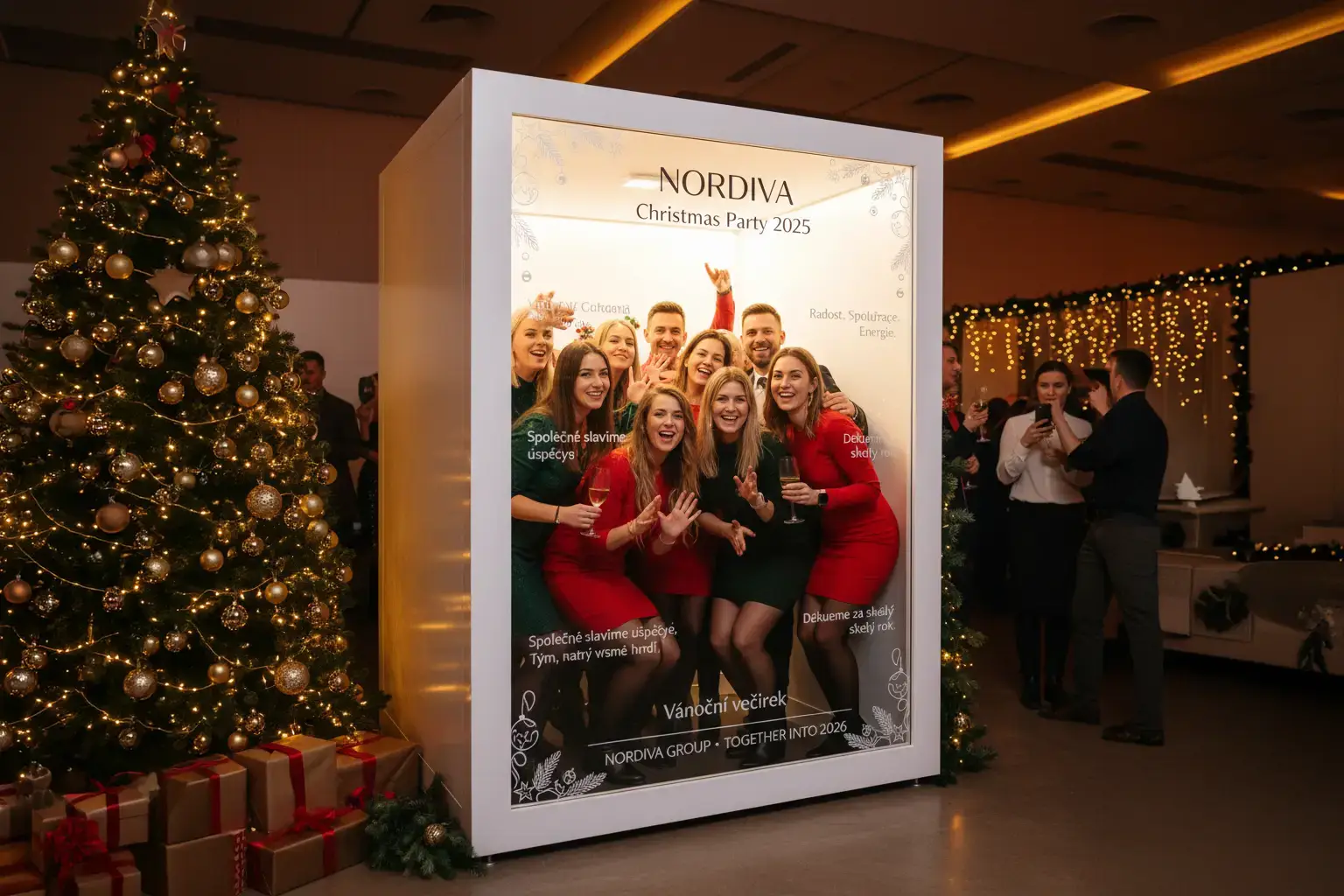 Fotobox vytvoří na večírku výrazné místo, které doladíme polepem skla přesně k vizuálu vaší značky. Hosté tak vstupují do scény, která podporuje atmosféru večera a přináší fotky plné firemního ducha.