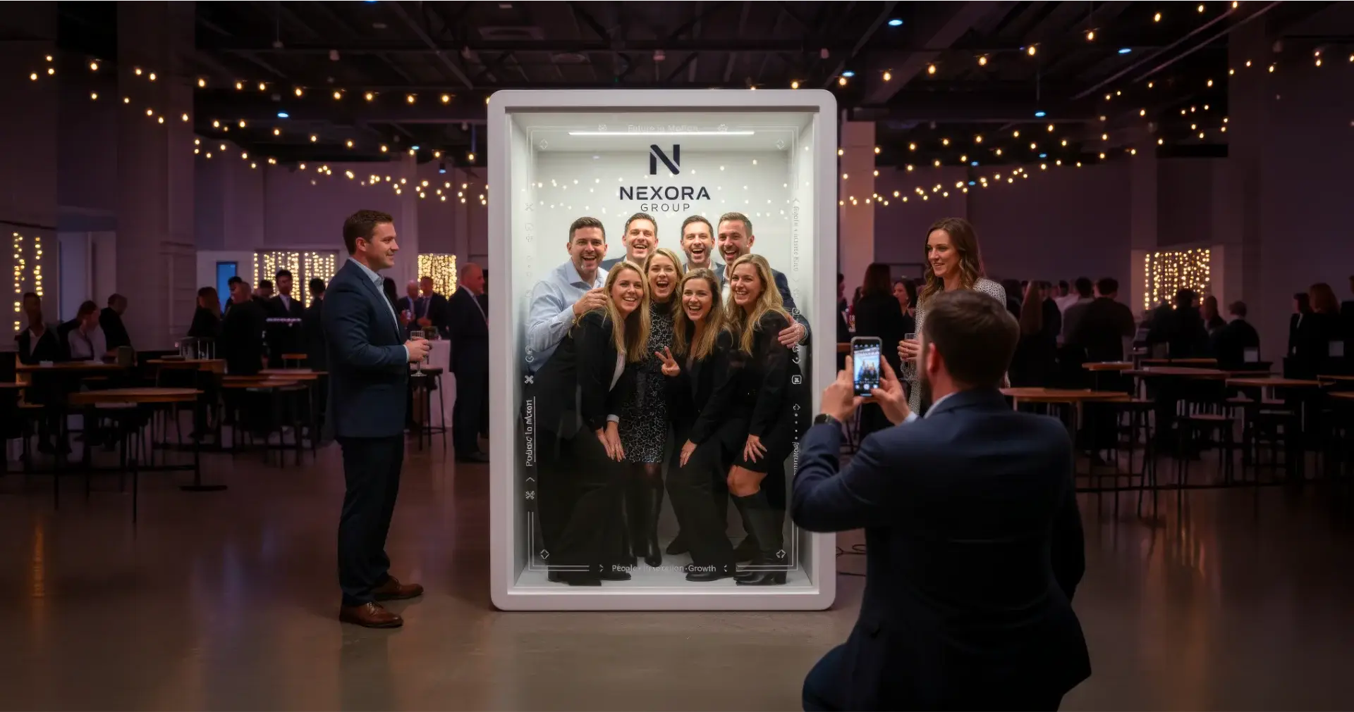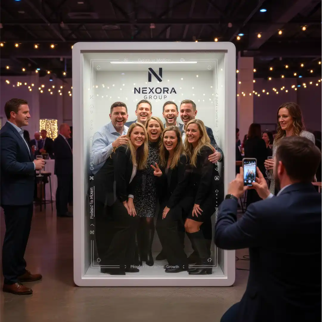 Fotobox vytvoří na večírku výrazné místo, které doladíme polepem skla přesně k vizuálu vaší značky. Hosté tak vstupují do scény, která podporuje atmosféru večera a přináší fotky plné firemního ducha.